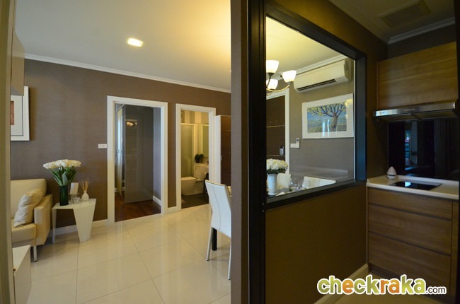 มีประตูกั้นห้องครัวให้ เป็นบานเลื่อนกระจกใส ทำให้เวลาประกอบอาหารกลิ่นไม่เข้าไปรบกวนภายในห้องนั่งเล่น