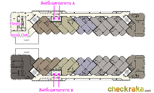 ชั้น 3 : ประกอบไปด้วย Fitness และ Social Club โดยมีห้องพักอาศัย อาคาร A มี 6 ยูนิต