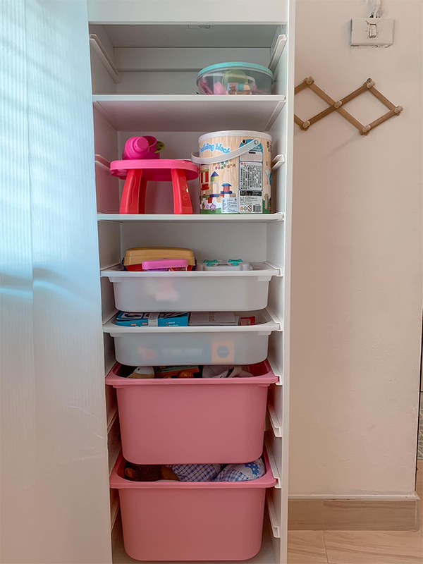 ซื้อชั้นสำหรับเก็บของทรงสูงสีขาวมาไว้สำหรับเก็บของเล่นลูก และเก็บของต่างๆ ราคา 1,200 บาท จาก IKEA