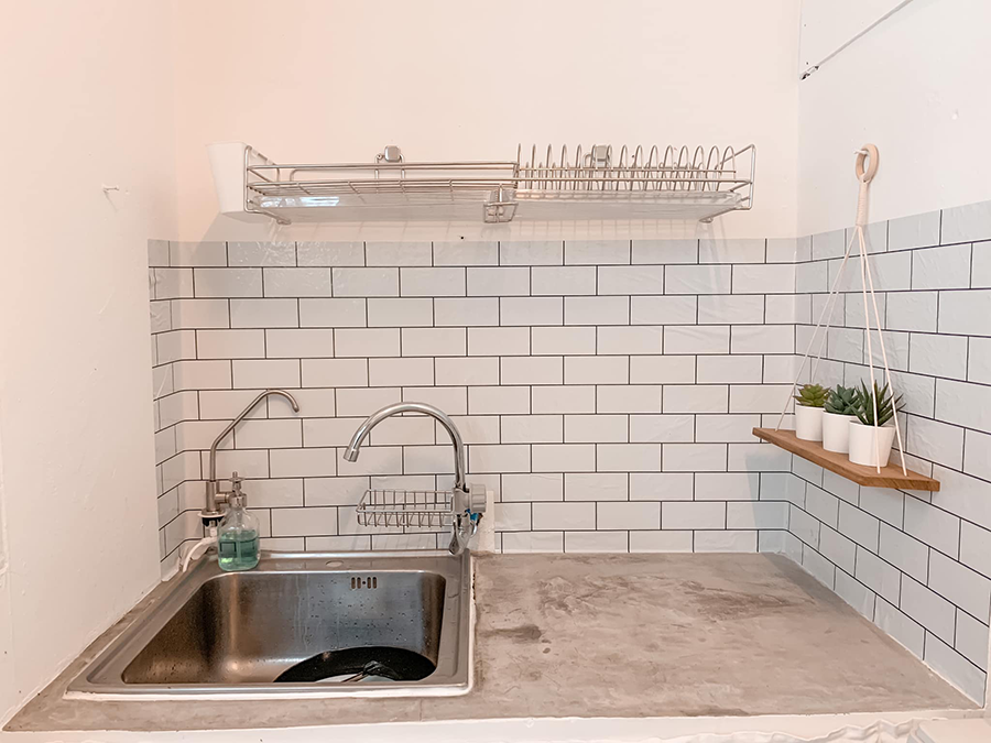 - ส่วนที่ผนังซื้อสติกเกอร์หรือ Backsplash มาติดไว้เพื่อให้ง่ายต่อการเช็ดทำความสะอาดเวลาที่ทำอาหารและมีการกระเดนไปเลอะผนัง ขนาด 60cm*3m ราคา 250 บาท จาก Shopee