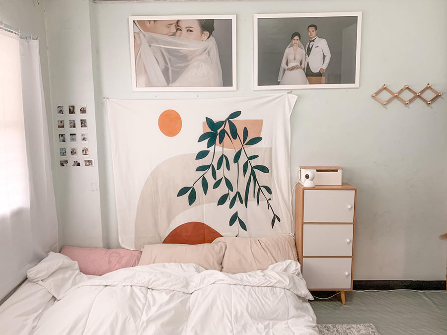 - ตกแต่งด้วยผ้าติดผนังพร้อมตะขอแขวน ราคา 240 บาท จาก Shopee