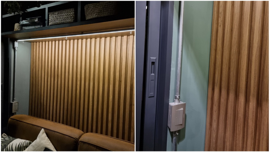 เริ่มด้วยห้องนั่งเล่น ไม่ได้ทำเพิ่มอะไรเยอะครับ แค่เพิ่ม ไฟเหลือบบริเวณใต้ชั้นเหนือโซฟา พร้อมเดินท่อสายไฟแบบติดลอย(1) ทั้งนี้เพื่อให้ดูเข้ากับธีมลอฟท์ของห้อง แต่จะเดินปกติโล่งๆเลยก็ดูจะไม่งามไม่มีอะไร แต่จะให้เดินแบบฝังผนังก็กลัวจะไปกันใหญ่ทั้งงบราคาและการเก็บงาน โดยเดินสายเสียบกับปลั๊กที่ซ่อนอยู่ด้านหลังโซฟาครับ