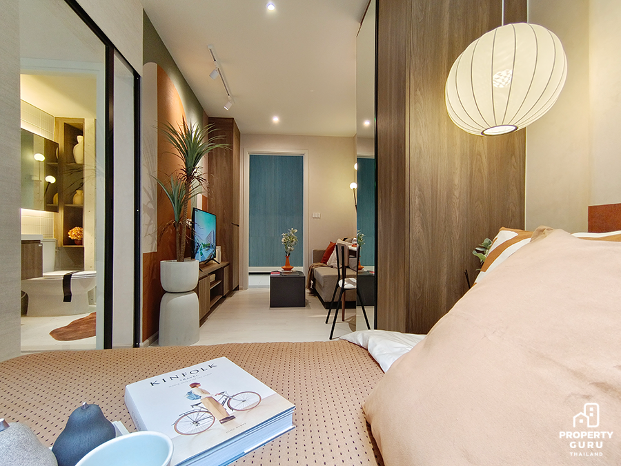 Studio 22.70-23.25 ตร.ม. ห้องมีความลึก 5 เมตร เพดานสูง 2.45 เมตร ฟังก์ชันครัวปิดประตูบานสไลด์ ได้เฟอร์นิเจอร์ครบ พร้อมเครื่องปรับอากาศ 1 เครื่อง
