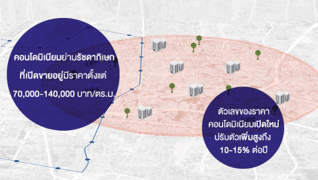 ในส่วนของคอนโดมิเนียมในโซนรัชดาภิเษก ตั้งแต่แยกลาดพร้าวไปจนถึงแยกพระราม 9 พบว่า โครงการที่เปิดขายอยู่มีราคาตั้งแต่ 80,000-150,000 บาทต่อ ตร.ม. เป็นที่ทราบกันดีว่าทำเลรัชดาฯ เองถูกยกให้เป็น New CBD เนื่องจากมีแหล่งงานขนาดใหญ่ จึงทำให้มูลค่าทั้งที่ดินและคอนโดมิเนียมมีราคาสูงขึ้นอย่างรวดเร็วรวมไปถึงการเข้ามาลงทุนของนักธุรกิจจีนที่กว้านซื้อห้องชุดของหลายๆ โครงการในย่านรัชดาภิเษก ทำให้ตัวเลขของราคาคอนโดมิเนียมเปิดใหม่ปรับตัวเพิ่มสูงถึง 10-15% ต่อปี