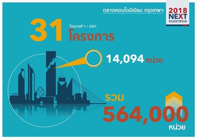 ประเด็นแรก ในช่วงไตรมาสแรกปี 2561 มีโครงการ คอนโดมิเนียม เกิดใหม่ โดยผู้ประกอบการทั้งรายใหญ่ และรายย่อยจำนวน 14,094 หน่วย จาก 31 โครงการ ซึ่งเพิ่มขึ้นใกล้เคียงกับที่ประมาณการไว้ก่อนหน้านี้ ทำให้มีจำนวนห้องชุดทั้งหมดในตลาด อยู่ที่ 564,000 หน่วย และจากการที่ที่ดินในใจกลางเมืองมีราคาปรับตัวสูงขึ้นอย่างต่อเนื่อง ทำให้ผู้พัฒนาไม่สามารถหาที่ดินพัฒนาโครงการได้เหมาะสม สัดส่วนห้องชุดที่เกิดใหม่จึงเกิดขึ้นบริเวณโซนสุขุมวิทตอนปลาย (29%) โซนพญาไท-รัชดาภิเษก-พระราม 9 (23%) โซนตากสิน เพชรเกษม (17%) เป็นหลัก สำหรับในครึ่งปีหลังนี้น่าจะเห็นโครงการใหม่เกิดขึ้นบริเวณแจ้งวัฒนะ และ รามอินทรามากขึ้น จากแผนการก่อสร้างรถไฟฟ้าสายสีชมพูที่เป็นรูปธรรมมากขึ้น อย่างไรก็ตาม สิ้นปีนี้หรือต้นปีหน้า ราคาคอนโดมิเนียมในกลุ่มซูเปอร์ลักซูรี่กลางเมืองที่เปิดตัวราคาตารางเมตรละ 400,000 บาท จะมีให้เห็นมากขึ้นเรื่อยๆ จากราคาที่ดินที่เพิ่มสูงขึ้น ในขณะที่ตลาดซิตี้คอนโดจะขยายตัวออกไปในส่วนต่อขยายรถไฟฟ้ามากขึ้น ทำให้ราคาไม่ปรับตัวสูงขึ้นมากนัก