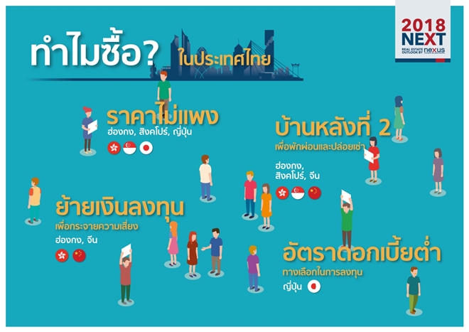 ประเด็นที่ 4 นักลงทุนรายย่อยต่างชาติ ยังคงให้ความสนใจเข้ามาลงทุนซื้อคอนโดมิเนียมอย่างต่อเนื่อง และมีจำนวนมากขึ้น ปัจจัยหลักก็ยังคงมาจากราคาสินค้าที่ยังคงถูกกว่ามาก เมื่อเทียบกับตลาดในประเทศ โดยเฉพาะอย่างยิ่งนักลงทุนจากฮ่องกง และญี่ปุ่น ประกอบกับระยะการเดินทางก็ไม่ไกล การซื้อคอนโดมิเนียมไว้ ก็เสมือนเป็นบ้านหลังที่ 2 เพื่อพักผ่อนและปล่อยเช่า ก่อนหน้านี้เราจะเห็นเทรนด์นี้ เฉพาะในสินค้าประเภท ลักซูรี่ และซูเปอร์ลักซูรี่เท่านั้น แต่ตอนนี้ตลาดไฮเอนด์ และตลาดระดับกลางก็เริ่มมีนักลงทุนให้ความสนใจมากขึ้น นอกจากนี้นักลงทุนจากประเทศจีน ก็ยังต้องการย้ายเงินลงทุนมายังต่างประเทศเพื่อกระจายความเสี่ยงอีกด้วย ประกอบกับผู้พัฒนาโครงการรายใหญ่ในประเทศเองก็ออกไปนำเสนอสินค้าในต่างประเทศมากขึ้นเรื่อยๆ อย่างต่อเนี่อง มีการสร้างความเชื่อมั่นด้วยการไปเปิดสำนักงานย่อย เพื่อบริการลูกค้าอีกด้วย จึงทำให้ตลาดต่างประเทศโดยเฉพาะในเอเชียเติบโตอย่างต่อเนื่อง