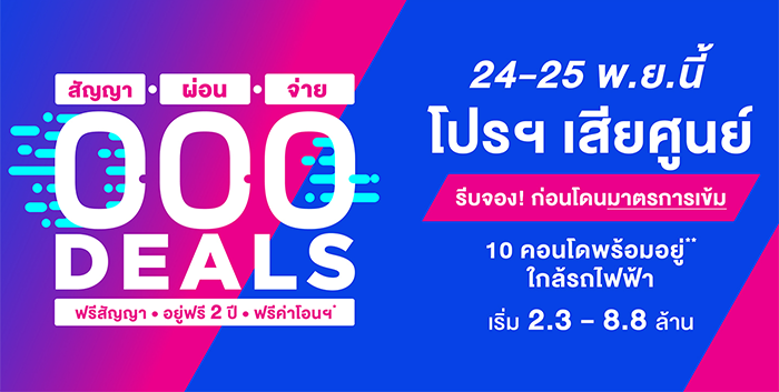 ราคาเริ่มต้น 2.3 - 8.8 ล้าน* พร้อมข้อเสนอพิเศษสุดเกินห้ามใจ ฟรีสัญญา /อยู่ฟรี 2 ปี /ฟรีค่าโอนฯ* รีบจอง ก่อนโดนมาตรการเข้ม แล้วพบกัน ในวันที่ 24 - 25 พ.ย. นี้ที่ Sales Gallery ทุกโครงการที่เข้าร่วมแคมเปญ