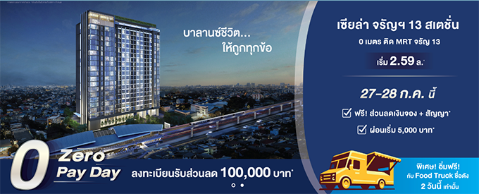 นอกจากนี้ โครงการเซียล่า จรัญฯ 13 สเตชั่น มีกำหนดจัดงาน ZERO PAY DAY ในวันที่ 27-28 กรกฎาคม กับข้อเสนอสุดพิเศษเพียง 2 วันนี้เท่านั้น ไม่ว่าจะเป็น ฟรี! ส่วนลดเงินจอง*สัญญา และเริ่มต้นผ่อนดาวน์แบบสบายกระเป๋าเพียง 5,000 บาท พร้อมอิ่มฟรีไปกับขบวน Food Truck ร้านดังภายในงาน ผู้ที่สนใจสามารถลงทะเบียนเข้างานได้แล้ววันนี้