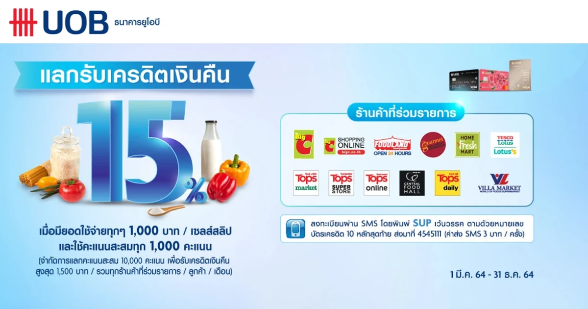 สิทธิพิเศษสำหรับลูกค้าบัตรเครดิตยูโอบี แลกรับเครดิตเงินคืน 15% เมื่อมียอดใช้จ่ายผ่านบัตรเครดิตยูโอบี ทุกๆ 1,000 บาท/เซลส์สลิป ที่ บิ๊กซี, บิ๊กซีออนไลน์, ฟู้ดแลนด์, เทสโก้ โลตัส, เทสโก้ โลตัสออนไลน์, วิลล่า มาร์เก็ต, กูร์เมต์ มาร์เก็ต, กูร์เมต์ มาร์เก็ตออน์ไลน์, โฮมเฟรชมาร์ท และท็อปส์ ซุปเปอร์มาร์เก็ต (ท็อปส์ ซูเปอร์สโตร์, ท็อปส์ เดลี่, ท็อปส์ออนไลน์ และเซ็นทรัล ฟู้ด ฮอลล์) ทุกสาขา
