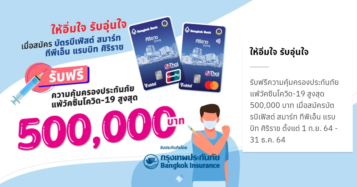 ให้อิ่มใจ รับอุ่นใจ เมื่อสมัครบัตรบีเฟิสต์ สมาร์ท ทีพีเอ็น แรบบิท ศิริราช วันนี้...รับฟรี! ความคุ้มครองประกันภัยแพ้วัคซีนโควิด-19 สูงสุด 500,000 บาท