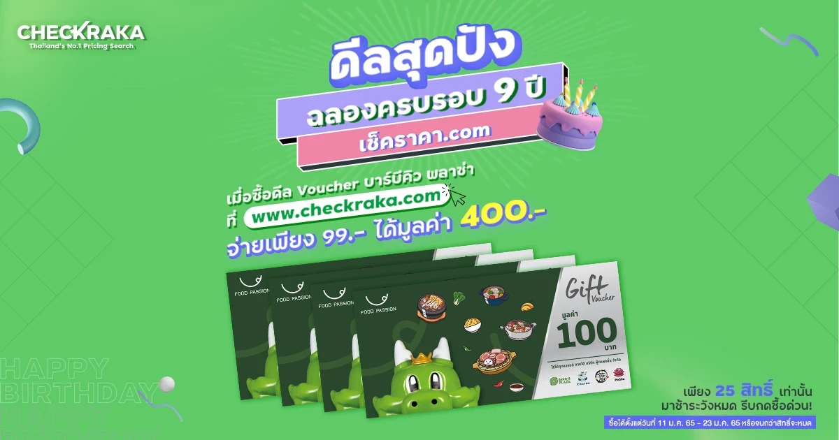 เช็คราคา.com ฉลองวันเกิดครบรอบ 9 ปี จัดดีล BBQ Plaza มาให้คุณได้อิ่มใหญ่ ในราคาไม่ถึงร้อย! เพียงสั่งซื้อดีลที่เช็คราคา จ่ายเพียง 99.- แต่ได้มูลค่าถึง 400.-
