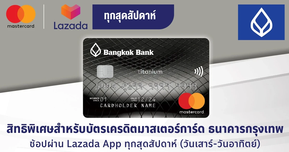 สิทธิพิเศษสำหรับบัตรเครดิตมาสเตอร์การ์ด ธนาคารกรุงเทพ ช้อปผ่าน Lazada App ทุกสุดสัปดาห์ (วันเสาร์-วันอาทิตย์) รับส่วนลด 100 บาท ใส่รหัส MCW122 เมื่อช้อปครบ 1,000 บาทขึ้นไป/คำสั่งซื้อ (จำกัด 524 สิทธิ์/สัปดาห์ นับรวมบัตรมาสเตอร์การ์ดทุกประเภทที่ออกจากทุกสถาบันในประเทศไทย)