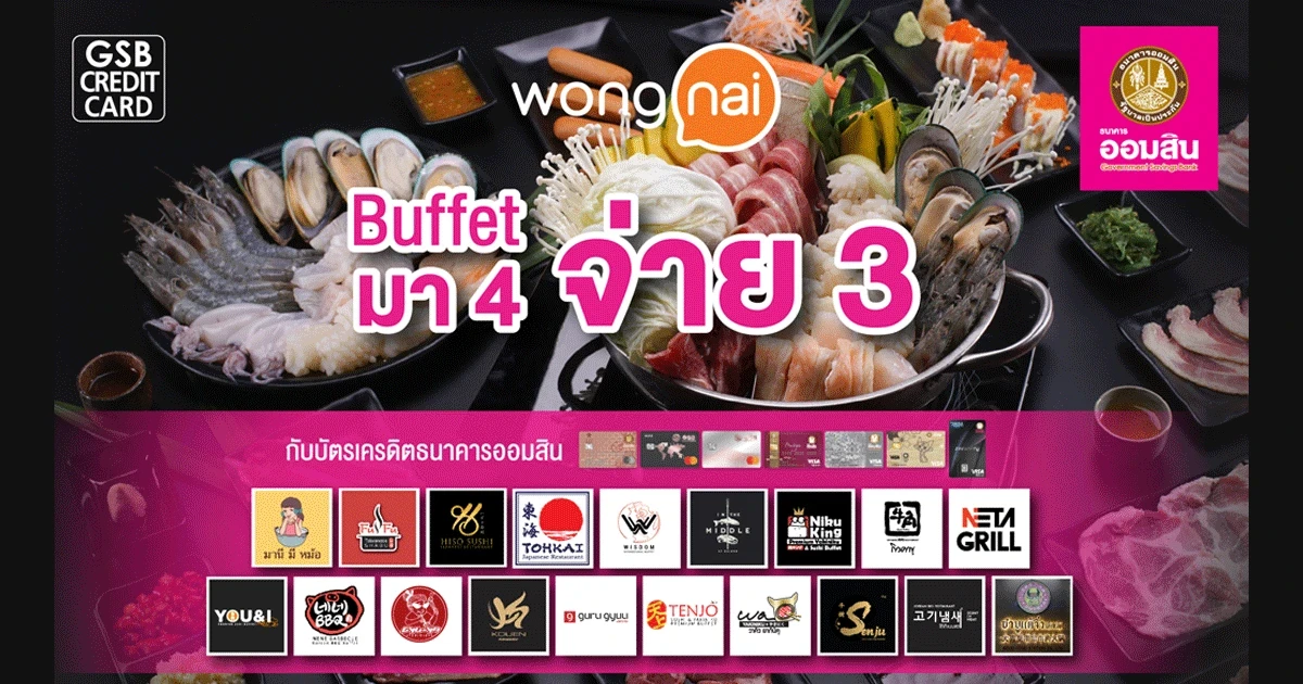 สิทธิพิเศษสำหรับลูกค้าบัตรเครดิตธนาคารออมสิน มา 4 จ่ายแค่ 3 ท่าน สำหรับบุฟเฟต์ ณ ร้านค้าที่ร่วมรายการกว่า 20 ร้านค้าโดยวงใน