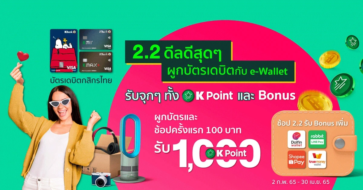 - รับคะแนน 1,000 K Point เมื่อผูกบัตรเดบิตของ บมจ. ธนาคารกสิกรไทย ("ธนาคาร") ครั้งแรกและใช้จ่ายผ่านบัตรดังกล่าวด้วย e-Wallet ที่ร่วมรายการ ได้แก่ Dolfin Wallet, Rabbit LINE Pay, ShopeePay และ Truemoney Wallet ตั้งแต่ 100 บาทขึ้นไปต่อรายการ