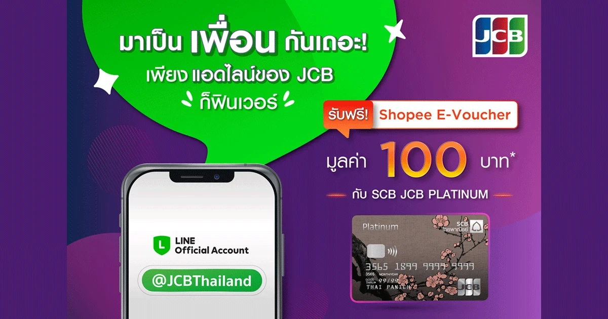 เมื่อเพิ่มเพื่อนใน JCB Thailand LINE Official Account และเพิ่มบัตรเครดิต SCB JCB Platinum สำเร็จภายในระยะเวลากิจกรรม หรือจนกว่าสิทธิ์จะหมด รับฟรี Shopee E-Voucher มูลค่า 100 บาท จำกัด 1 สิทธิ์ / บัญชี JCB Thailand LINE Official Account / ระยะเวลารายการส่งเสริมการขาย