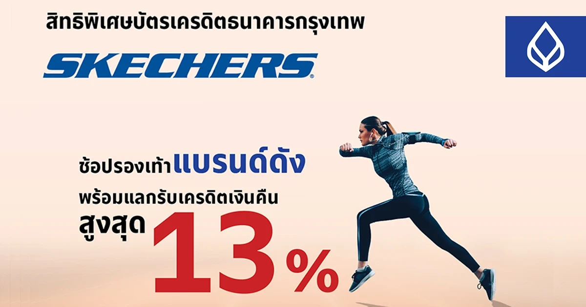 (เฉพาะรายการใช้จ่ายแบบเต็มจำนวนไม่รวมผ่อนชำระ Be Smart) ณ สาขาที่ร่วมรายการ ได้แก่เอาท์เล็ต สแควร์ เมืองทองธานี, สยามพรีเมียมเอาท์เลท, เทสโก้ โลตัส รามอินทรา, เกทเวย์ แอท บางซื่อ, เดอะพาซิโอ พาร์ค, สยามสแควร์วัน, วี สแควร์ นครสวรรค์, แพชชั่น ระยอง, แฟรี่พลาซ่า ขอนแก่น, ไอคอนสยาม, เอสพลานาด รัชดาภิเษก, เดอะมอลล์ โคราช, อยุธยา ซิตี้ พาร์ค, บิ๊กซี พระราม4, บิ๊กซี พระราม2 และ สามย่านมิตรทาวน์ - เงื่อนไขการขายสินค้าหรือบริการเป็นไปตามที่ร้านค้ากำหนด ธนาคารฯ ไม่มีส่วนเกี่ยวข้องกับสินค้าหรือบริการใดๆ หากมีข้อสงสัยกรุณาติดต่อสอบถามร้านค้าที่ทำรายการโดยตรง เงื่อนไขแลกใช้คะแนนสะสมรับเครดิตเงินคืน : - สิทธิพิเศษเมื่อใช้จ่ายผ่านบัตรเครดิตธนาคารกรุงเทพที่ Skechers Shop