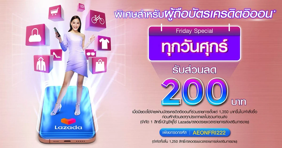 สิทธิพิเศษสำหรับผู้ถือบัตรเครดิตอิออน ทุกวันศุกร์ รับส่วนลด 200 บาท เมื่อมียอดใช้จ่ายผ่านบัตรเครดิตอิออนที่ร่วมรายการตั้งแต่ 1,350 บาทขึ้นไป/คำสั่งซื้อ ก่อนหักส่วนลดทุกประเภทและไม่รวมค่าขนส่ง (จำกัด 1 สิทธิ์/บัญชีผู้ใช้ Lazada/ตลอดระยะเวลารายการส่งเสริมการขาย) เพียงกรอกรหัส AEONFRI222 (จำกัด 1,250 สิทธิ์/ตลอดระยะเวลารายการส่งเสริมการขาย)
