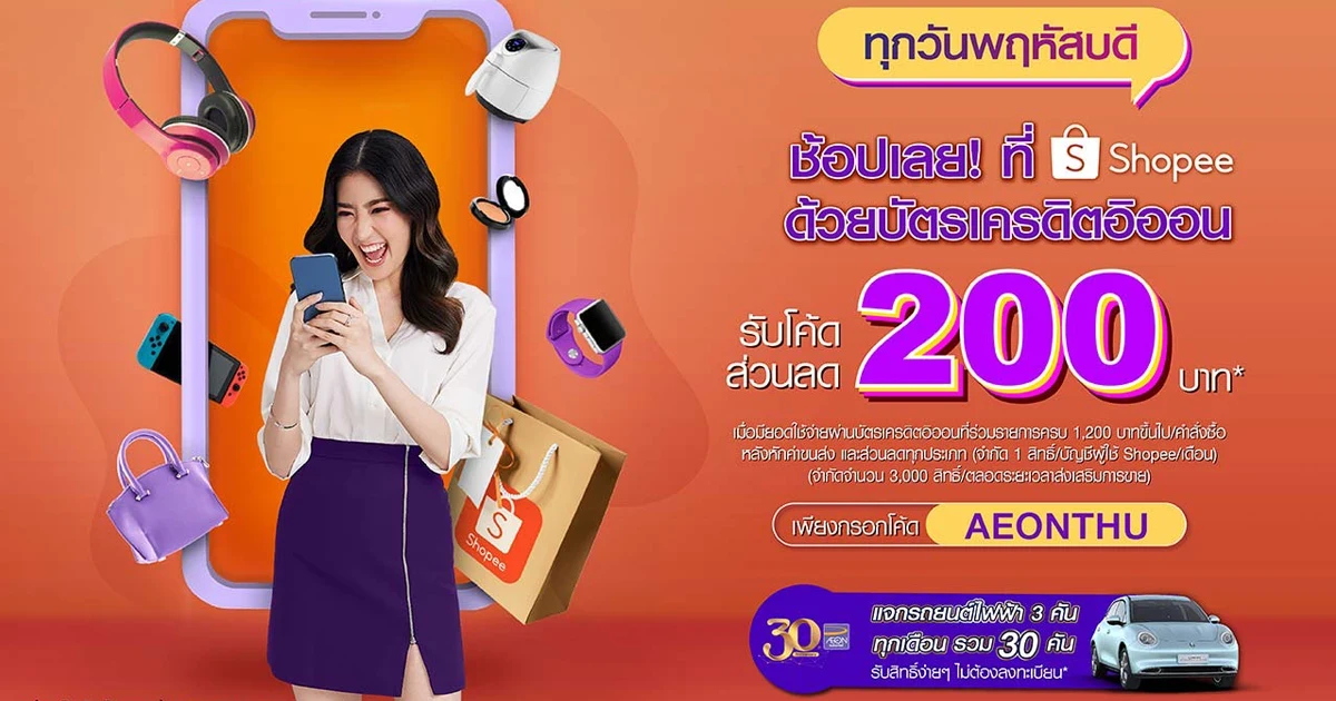 สิทธิพิเศษสำหรับผู้ถือบัตรเครดิตอิออน รับส่วนลด 200 บาท ทุกวันพฤหัสบดี เวลา 12.00 น. – 23.59 น. เมื่อมียอดใช้จ่ายผ่านบัตรเครดิตอิออนที่ร่วมรายการ ครบ 1,200 บาทขึ้นไป/คำสั่งซื้อ หลังหักค่าขนส่ง และส่วนลดทุกประเภท (จำกัด 1 สิทธิ์/บัญชีผู้ใช้ Shopee /เดือน) เพียงกรอกรหัส AEONTHU (จำกัดทั้งสิ้น 3,000 สิทธิ์/ตลอดระยะเวลารายการส่งเสริมการขาย)