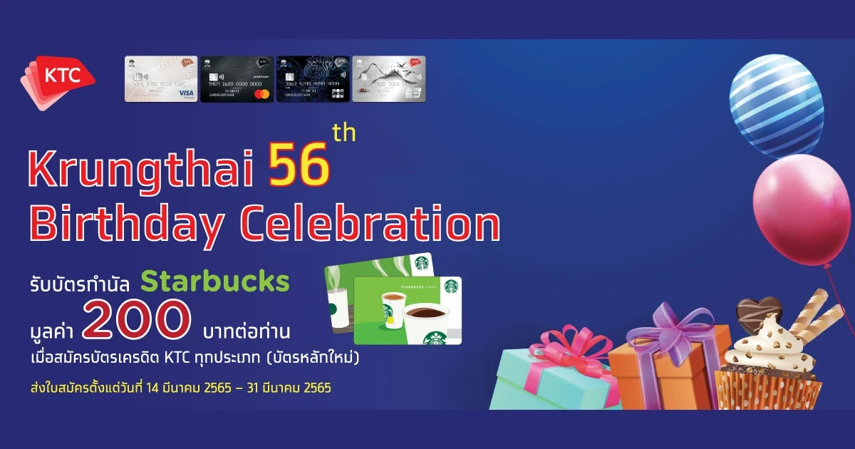 Krungthai 56th Birthday Celebration สมัครบัตรเครดิต KTC และได้รับการอนุมัติบัตรฯ โดยมียอดใช้จ่ายผ่านบัตรฯ รวมกันตั้งแต่ 5,000 บาท ภายใน 2 รอบบัญชี รับบัตรกำนัล Starbucks 200 บาท