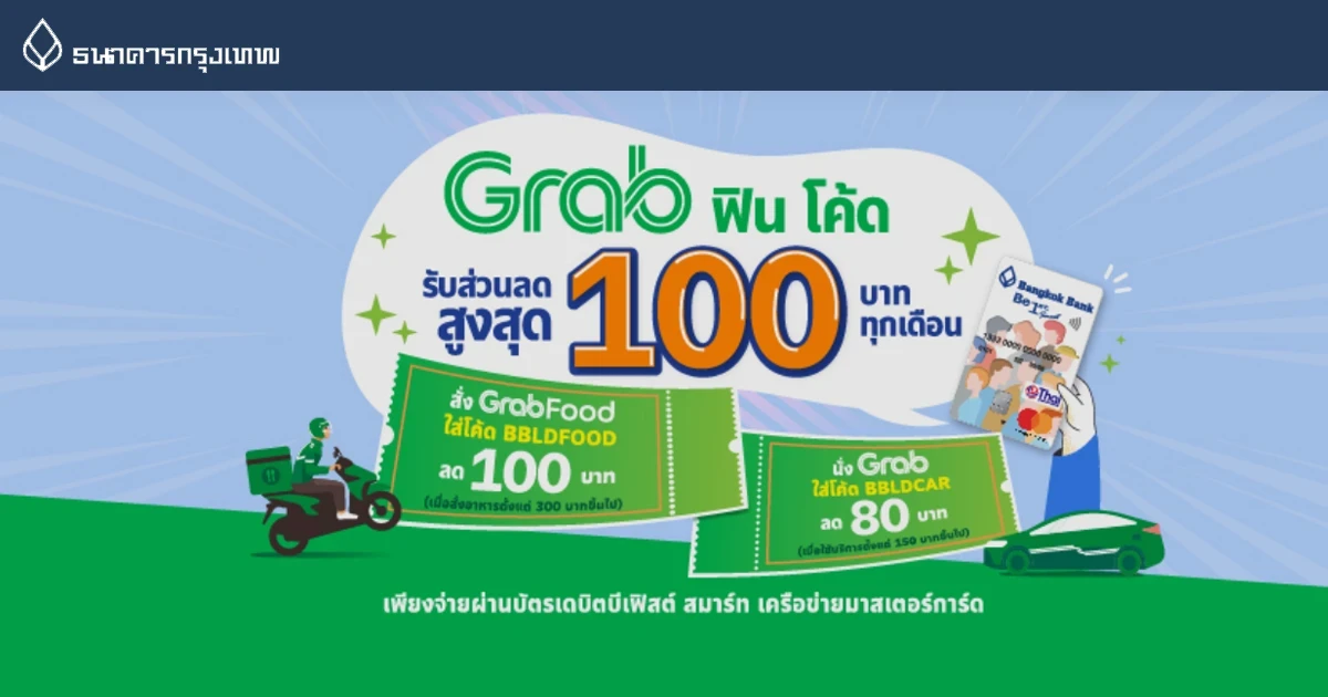 - รับส่วนลด 100 บาท/ครั้ง เมื่อใช้บริการ GrabFood ตั้งแต่ 300 บาทขึ้นไป เพียงกรอกโค้ด "BBLDFOOD" ก่อนทำการสั่งอาหาร โดยผู้ใช้จะต้องเป็นผู้ชำระค่าบริการส่วนเกินจากส่วนลดเอง