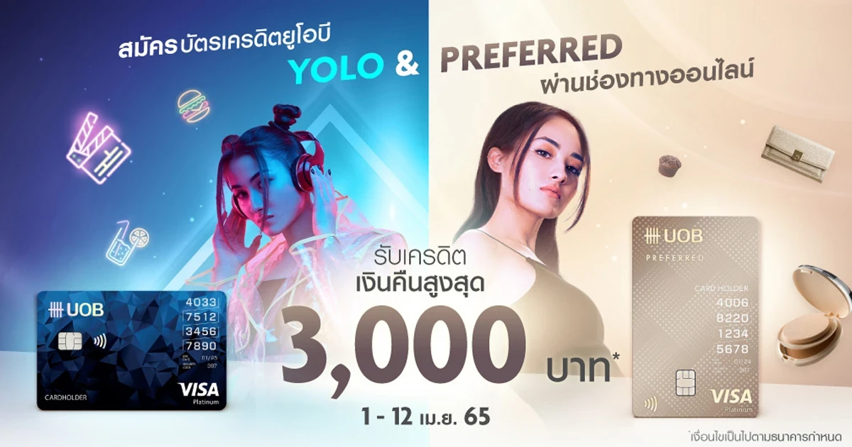 - โปรโมชั่นพิเศษ สำหรับลูกค้าใหม่ที่สมัครบัตรเครดิตยูโอบีโยโล่ แพลทินัม/พรีเฟอร์ ผ่านช่องทางออนไลน์เท่านั้น ระหว่างวันที่ 1 เม.ย.65 – 12 เม.ย. 65 และได้รับการอนุมัติบัตรเครดิตจากธนาคารภายในวันที่ 25 เม.ย. 65 รับเครดิตเงินคืน เพิ่มอีก 1,000 บาท เมื่อมียอดใช้จ่ายสะสมผ่านบัตรเครดิตยูโอบี ตั้งแต่ 10,000 บาทขึ้นไป ภายใน 30 วัน นับจากวันที่บัตรเครดิตฯ ได้รับการอนุมัติ