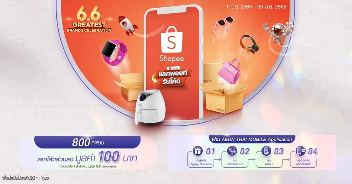 สิทธิพิเศษสำหรับผู้ถือบัตรเครดิตอิออน* แลกรับโค้ดส่วนลด Shopee 100 บาท เพียงแลก AEON Happy Point 800 คะแนนผ่าน AEON THAI MOBILE Application