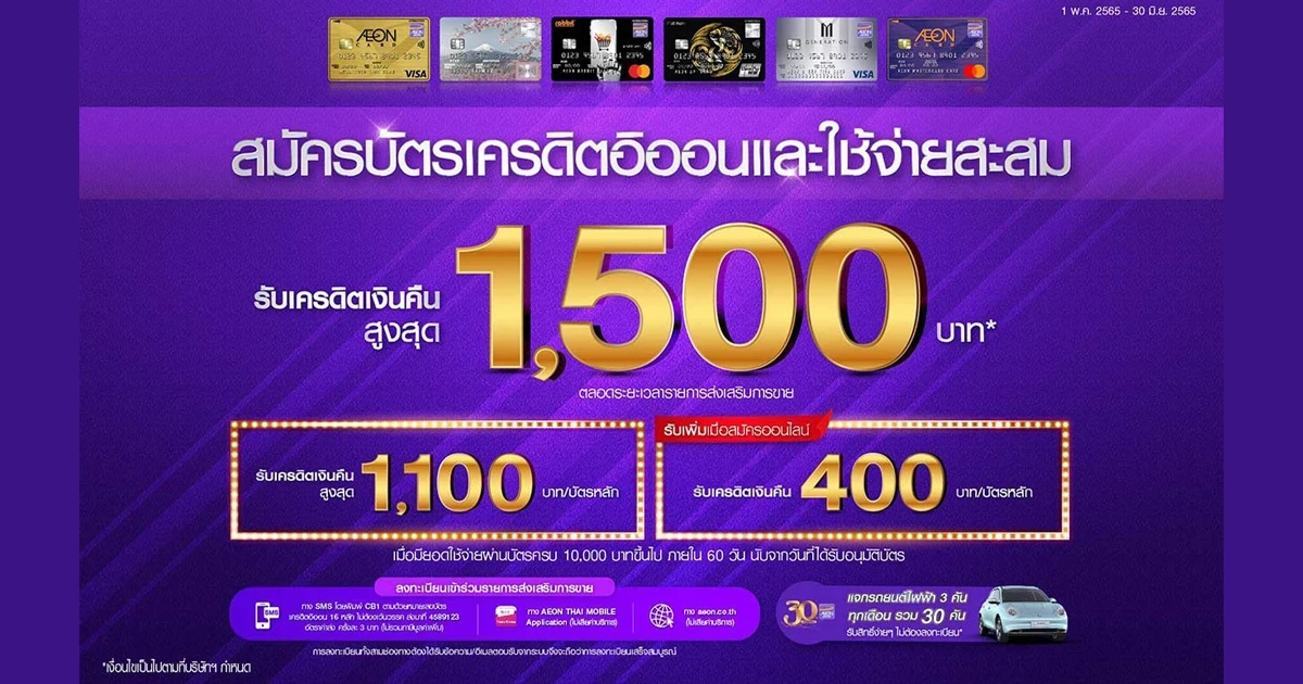 - **รับเพิ่ม เครดิตเงินคืน 600 บาท / บัตรหลัก เมื่อมียอดใช้จ่ายสะสมผ่านบัตรครบ 10,000 บาทขึ้นไป และจะต้องทำการลงทะเบียนเพื่อรับสิทธิ์ ภายใน 60 วันนับจากวันอนุมัติบัตร เฉพาะบัตรเครดิตอิออนคลาสสิค (วีซ่า/มาสเตอร์/เจซีบี), บัตรเครดิต AEON M GEN VISA, บัตรเครดิตบี-ควิกวีซ่า, บัตรเครดิตคลับไทยแลนด์ (วีซ่า/มาสเตอร์/เจซีบี) - บริษัทฯ จะคำนวณสิทธิ์ในการรับเครดิตเงินคืน จากยอดใช้จ่ายสะสมผ่านบัตรเครดิตที่ร่วมรายการ เฉพาะบัตรหลัก และไม่รวมถึงรายการใช้จ่าย การชำระค่าสินค้า/บริการทุกรายการในหมวดประกันภัย/ชีวิต เช่น กรมธรรม์ประกัน การชำระค่าเบี้ยประกันภัย ผ่านตัวแทนรับชำระออนไลน์ (MCC Code 5960, 6300, 9223), สินเชื่อเงินกู้และเช่าซื้อ, การซื้อหน่วยลงทุน/กองทุนรวมทุกรายการ (MCC Code 6211), การแลกเปลี่ยนเงินตราต่างประเทศ (MCC Code 6051, 4829), การเบิกถอนเงินสดล่วงหน้า, ดอกเบี้ย ค่าธรรมเนียมการใช้วงเงิน ค่าปรับ ค่าธรรมเนียมและภาษีอากรต่างๆ และรายการที่มีการยกเลิกหรือคืนสินค้า/บริการ