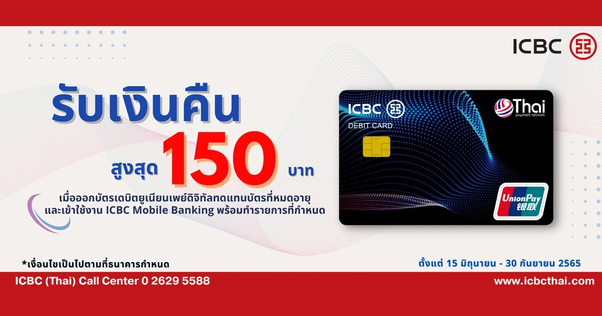 รับเงินคืนสูงสุด 150 บาท เมื่อออกบัตรเดบิตยูเนียนเพย์ดิจิทัลทดแทนบัตรที่หมดอายุ และเข้าใช้งาน ICBC Mobile Banking พร้อมทำรายการที่กำหนด