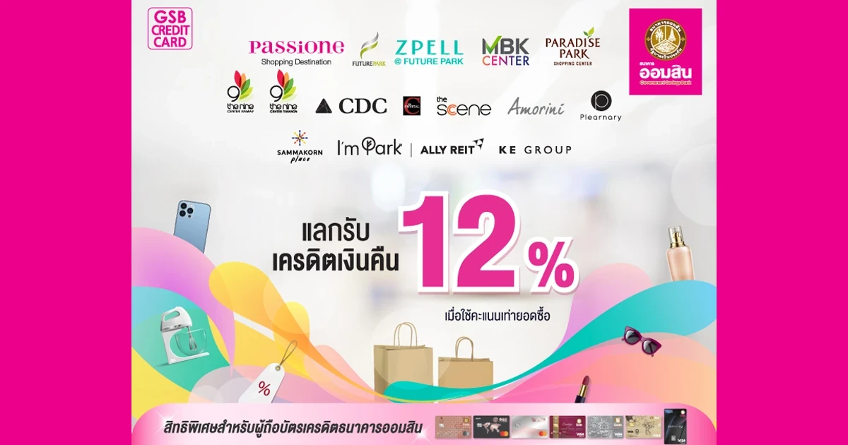 สิทธิพิเศษสำหรับผู้ถือบัตรเครดิตธนาคารออมสิน แลกรับเครดิตเงินคืน 12% เมื่อใช้จ่ายผ่านบัตรตั้งแต่ 1,000 บาทขึ้นไป/เซลล์สลิป และใช้คะแนนแลกรับเครดิตเงินคืนเท่ายอดซื้อ (จำกัดแลกคะแนนสูงสุด 100,000 คะแนน/บัตร/เดือน/กลุ่มศูนย์การค้าฯ)