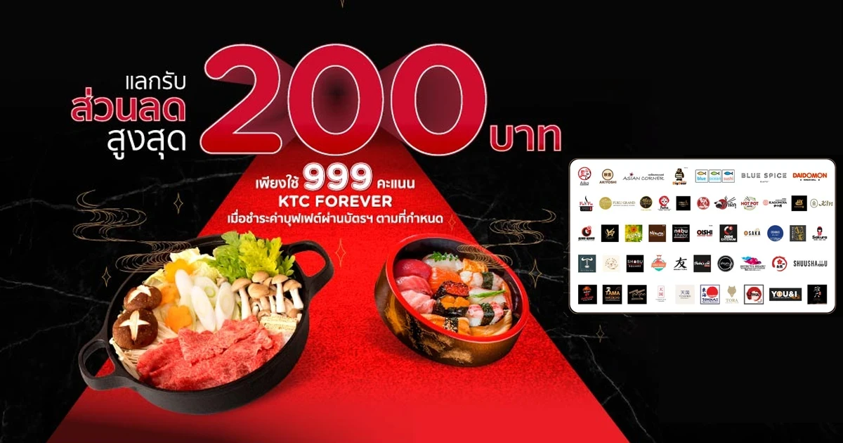 - ขอสงวนสิทธิ์การใช้คะแนนแลกรับส่วนลดตามรายการนี้ สมาชิกสามารถใช้คะแนนจำนวน 999 คะแนน KTC FOREVER แลกรับส่วนลดสูงสุด 200 บาทสำหรับการซื้อสินค้า/บริการรายการนั้นๆ ได้ตามเงื่อนไขที่กำหนด