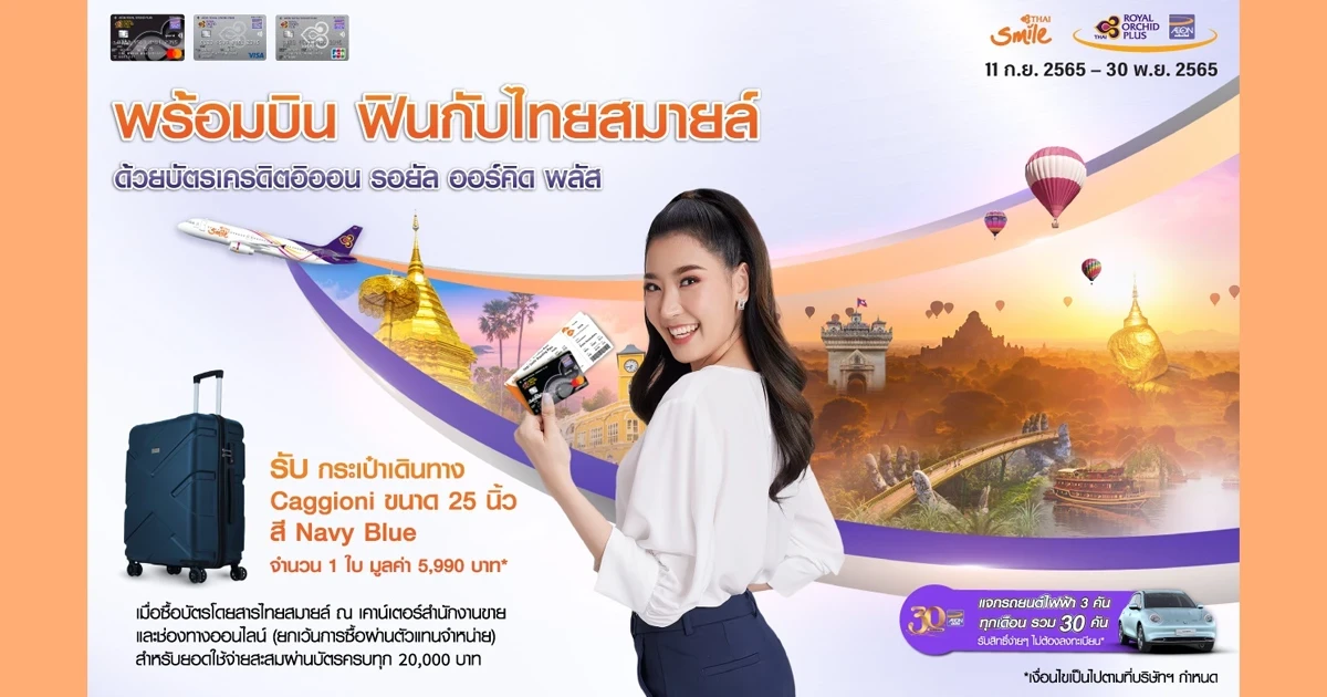 รับกระเป๋าเดินทาง Caggioni ขนาด 25 นิ้ว จำนวน 1 ใบ มูลค่า 5,990 บาท เมื่อซื้อบัตรโดยสารไทยสมายล์ ณ ห้องจำหน่ายบัตรโดยสารและช่องทางออนไลน์ Thai Smile Airways และ Thai Airways (TG4 Digits ทำการบินโดย Thai Smile Airways) (ยกเว้นการซื้อผ่านตัวแทนจำหน่ายหรือ Agent) สำหรับยอดใช้จ่ายสะสมผ่านบัตรครบทุกๆ 20,000 บาท