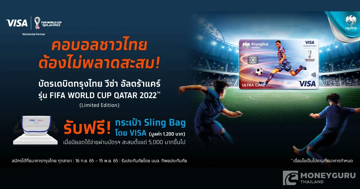 - เมื่อลูกค้าสมัครบัตรเดบิตกรุงไทยใหม่ ประเภท Krungthai Ultra care หรือ Palladium ระหว่างวันที่ 16 กันยายน 2565 ถึงวันที่ 15 พฤศจิกายน 2565 และมียอดใช้จ่ายสะสมผ่านบัตรฯ ตั้งแต่ 5,000 บาทขึ้นไป ภายในระยะเวลาส่งเสริมการขายนี้ รับฟรี กระเป๋า Sling Bag จำนวน 1 ใบ