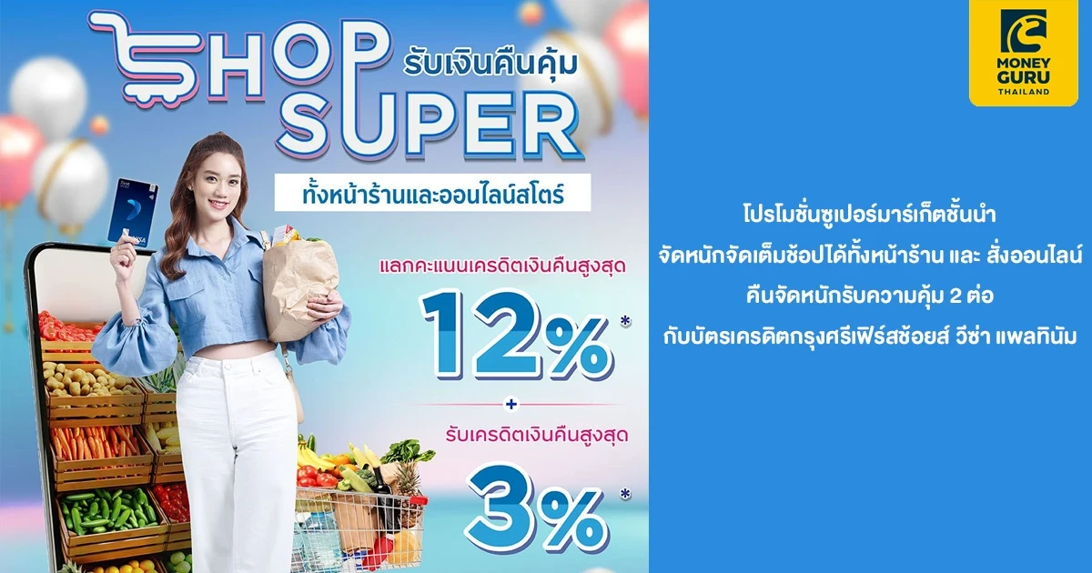- เฉพาะรายการใช้จ่ายแบบชำระเต็มจำนวนผ่านวงเงินบัตรเครดิตกรุงศรีเฟิร์สช้อยส์ วีซ่า แพลทินัม ที่ซูเปอร์มาร์เก็ตและไฮเปอร์มาร์เก็ตที่ร่วมรายการ ในวันที่ 1 พ.ย. 65 - 31 ม.ค. 66