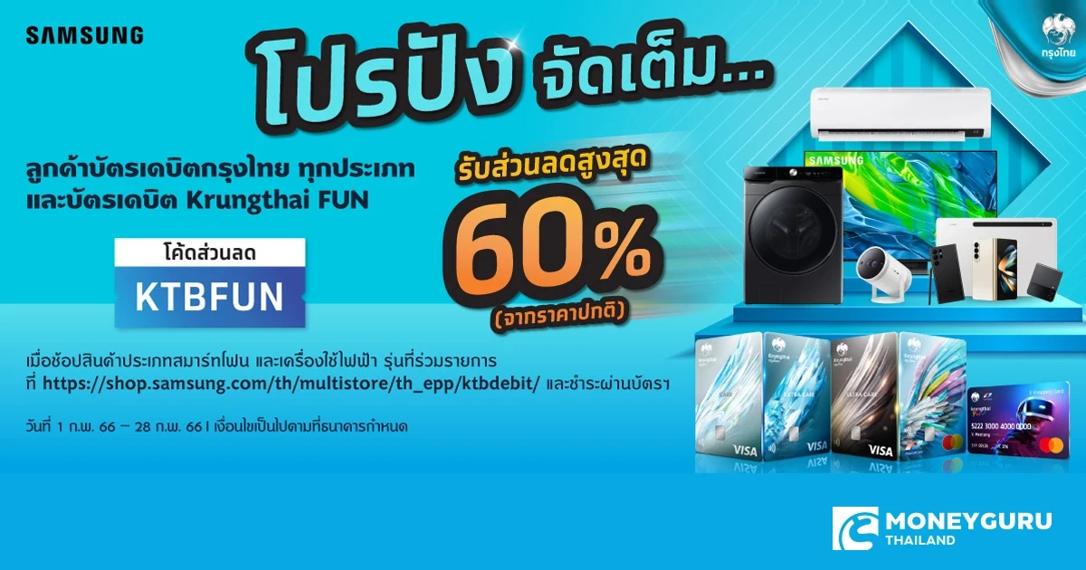 - รับส่วนลดสูงสุด 60% จากราคาปกติ สำหรับสินค้าประเภทสมาร์ทโฟน และเครื่องใช้ไฟฟ้า รุ่นที่ร่วมรายการ ระหว่างวันที่ 1 กุมภาพันธ์ 2566 – 28 กุมภาพันธ์ 2566 เฉพาะที่ https://shop.samsung.com/th/multistore/th_epp/ktbdebit/