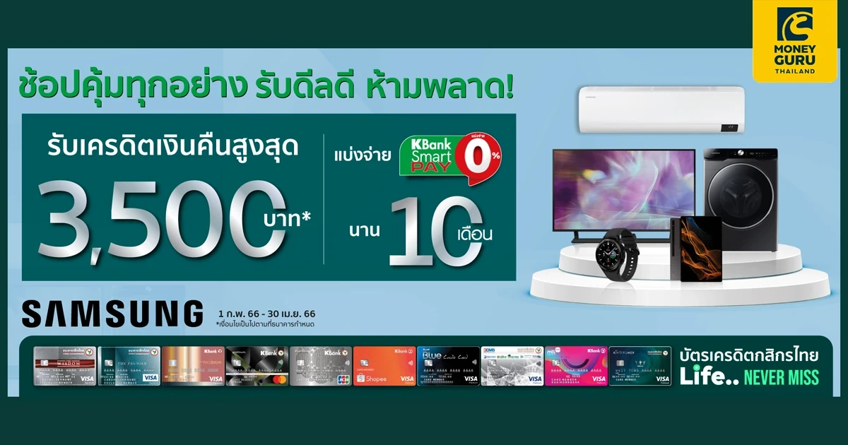 - โปรดตรวจสอบรายละเอียดโปรโมชั่น เงื่อนไขสินค้า และวิธีการทำรายการผ่อนชำระที่ https://www.samsung.com/th/ และ https://shop.samsung.com/th/ และ www.kasikornbank.com/th/promotion/credit-card/ หรือ K-Contact Center โทร. 02-8888888