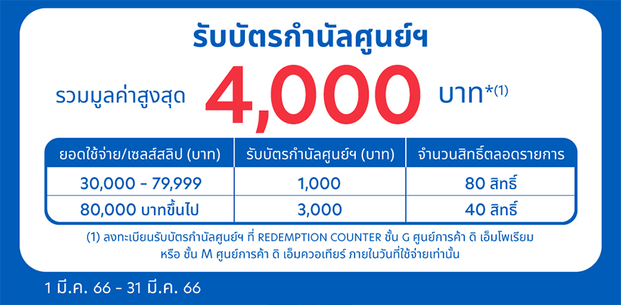 - จำกัดการรับบัตรกำนัลศูนย์ฯ รวมมูลค่าสูงสุด 4,000 บาท / ผู้ถือบัตร / ตลอดรายการ โดยจำกัดการรับบัตรกำนัลศูนย์ฯมูลค่า 1,000 บาท / ผู้ถือบัตร / ตลอดรายการ และจำกัดการรับบัตรกำนัลศูนย์ฯมูลค่า 3,000 บาท / ผู้ถือบัตร / ตลอดรายการ