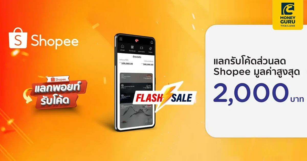 - ใช้คะแนน [จำนวน 5,999 คะแนน] แลกรับโค้ดส่วนลด Shopee มูลค่า 2,000 บาท กำหนดยอดใช้จ่ายขั้นต่ำ 9,999 บาท / รายการ - การแลกรับส่วนลดตามรายการนี้ เฉพาะสำหรับการชำระค่าสินค้า ต่อ 1 ยอดซื้อต่อรายการเท่านั้น และในกรณีที่มีมูลค่าส่วนต่างภายหลังการหักส่วนลด สมาชิกจะต้องชำระเงินส่วนต่างดังกล่าวด้วยบัตรฯ ใบเดียวกันกับบัตรฯ ที่ใช้คะแนนแลกรับส่วนลดเท่านั้น