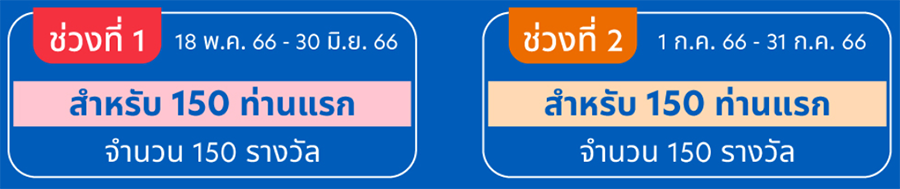 *จำกัด 150 รางวัล/ช่วง และจำกัดสูงสุด 300 รางวัลตลอดระยะเวลาส่งเสริมการขาย และจำกัด 1 รางวัล/ท่าน/ตลอดระยะเวลาส่งเสริมการขาย