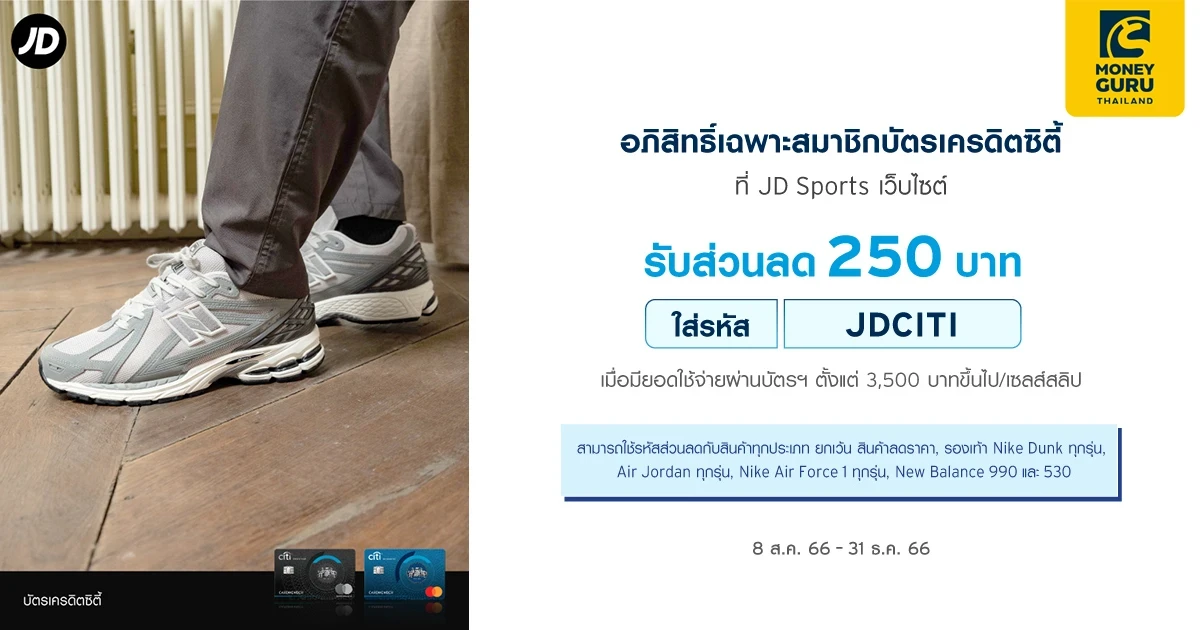 อภิสิทธิ์เฉพาะสมาชิกบัตรเครดิตซิตี้ ที่เว็บไซต์ JD Sports รับส่วนลด 250 บาท