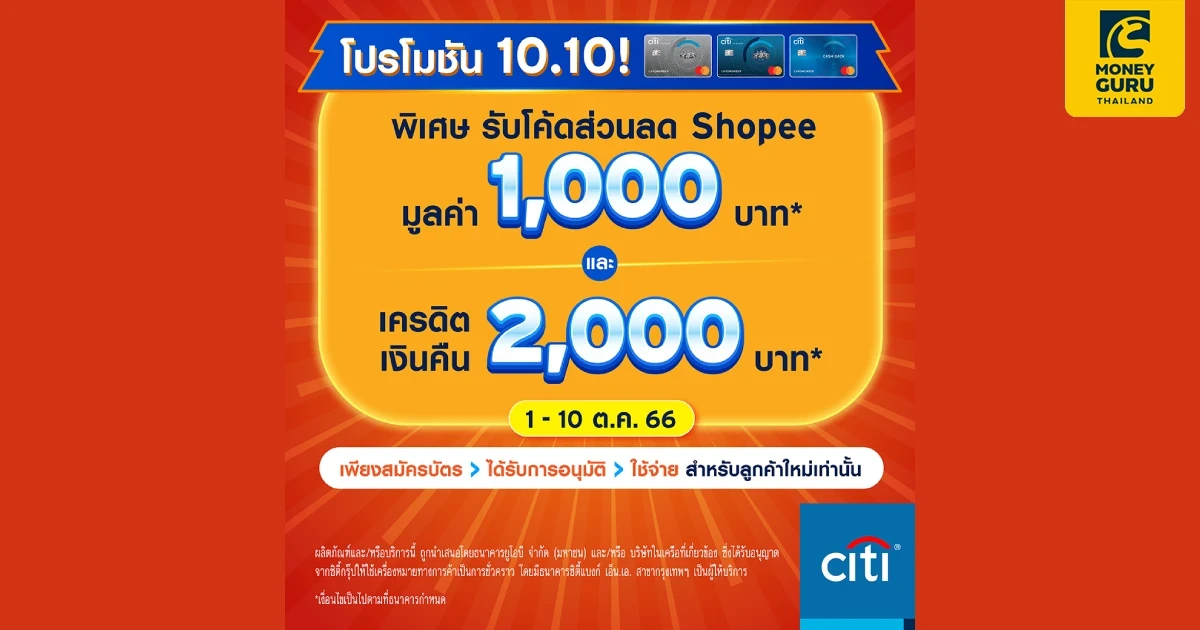 ข้อเสนอพิเศษสำหรับบัตรเครดิตซิตี้ โปรโมชัน 10.10 นี้ พิเศษ! รับโค้ดส่วนลด Shopee มูลค่า 1,000 บาท* และเครดิตเงินคืน 2,000 บาท*