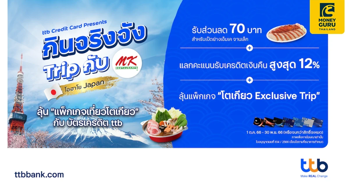 ทีเอ็มบีธนชาต หรือ ทีทีบี สานต่อ “กินจริงจัง ต้องบัตรเครดิต ttb” ตอกย้ำความเป็นผู้นำบัตรเครดิตที่ให้สิทธิประโยชน์สูงสุดในหมวดร้านอาหาร หลังประสบความสำเร็จกับกิจกรรมเปิดตี้บุฟเฟต์ โดยล่าสุด บัตรเครดิต ttb จับมือ MK Restaurants ร้านสุกี้ที่อยู่คู่คนไทยมาหลายทศวรรษ เพื่อเสิร์ฟสิทธิพิเศษที่เหนือกว่าด้วยหมวดร้านอาหารที่ครอบคลุมยิ่งกว่าเดิม กินวันไหนก็คุ้ม กับแคมเปญลุ้นโชคใหญ่ “กินจริงจัง Trip กับ MK” ชวนผู้ถือบัตร ttb สายสุกี้ลุ้นโชคใหญ่เที่ยวฟรีแดนซามูไร และสิทธิ์ส่วนลดแลกคะแนนรับเครดิตเงินคืน เมื่อรับประทานอาหารที่ร้าน MK Restaurants ทุกสาขา (ยกเว้น MK Gold, MK Live และ MK Restaurants สาขาเซ็นทรัลลาดพร้าว ไม่เข้าร่วมรายการ) ระหว่างวันที่ 1 ต.ค. 2566 – 30 พ.ย. 2566 ดังนี้