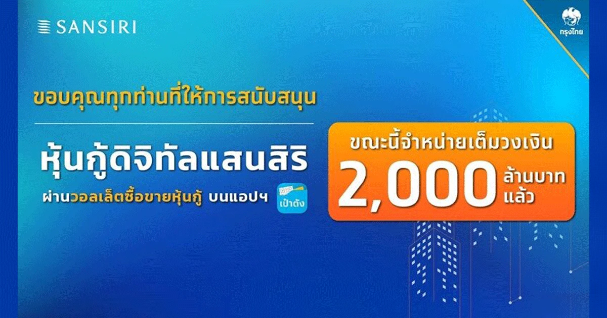 "หุ้นกู้ดิจิทัลแสนสิริ" สร้างประวัติศาสตร์หน้าใหม่ ประชาชนตอบรับจองซื้อผ่านแอปฯ "เป๋าตัง" ล้นหลาม กวาดยอดขายครบ 2,000 ล้านบาท ภายใน 3 นาที 38 วินาที ตอกย้ำความสำเร็จของความร่วมมือระหว่าง "แสนสิริ" และ "กรุงไทย" เปิดขายหุ้นกู้ภาคเอกชนออนไลน์เต็มรูปแบบผ่านวอลเล็ต เป็นอสังหาริมทรัพย์ "รายแรกในเอเชีย" ตอบโจทย์ผู้ลงทุนยุคใหม่ ซื้อขาย ขายง่ายได้ทันที 24 ชั่วโมง ให้คนไทยทุกคนเข้าถึงการลงทุนได้อย่างทั่วถึงและเท่าเทียม