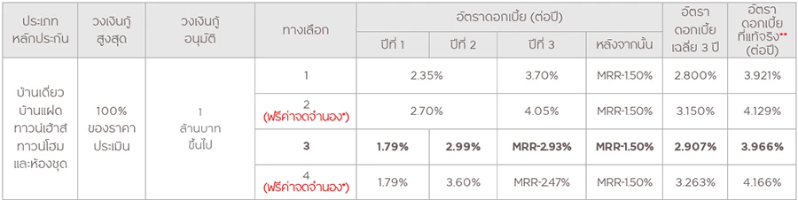 - ทุกทางเลือกอัตราดอกเบี้ย : สามารถเลือกผ่อนต่ำ ล้านละ 3,500 บาท/เดือน ในปีที่ 1 ได้