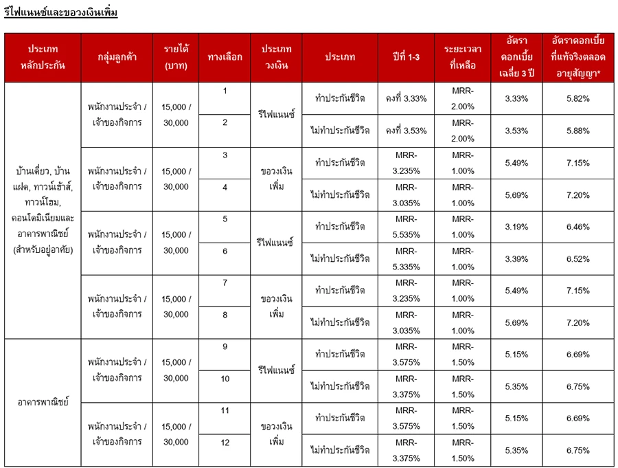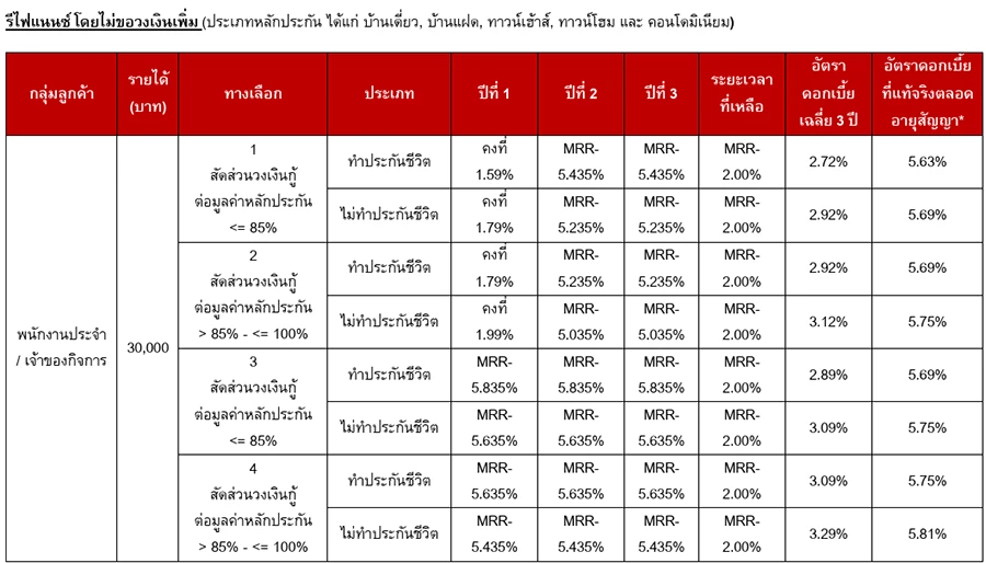 - อัตราดอกเบี้ยที่แท้จริง (EIR) สินเชื่อบ้านรีไฟแนนซ์ปัจจุบัน อยู่ระหว่าง 4.54% - 4.65% ต่อปี