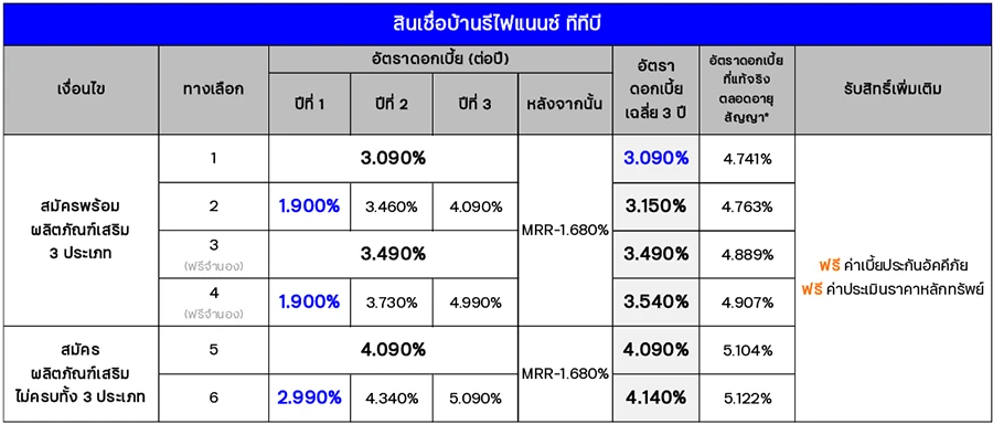 - ยกเว้นค่าประเมินราคาหลักทรัพย์, ค่าอากรสแตมป์ และค่าเบี้ยประกันอัคคีภัย 3 ปีแรก ทุกทางเลือก