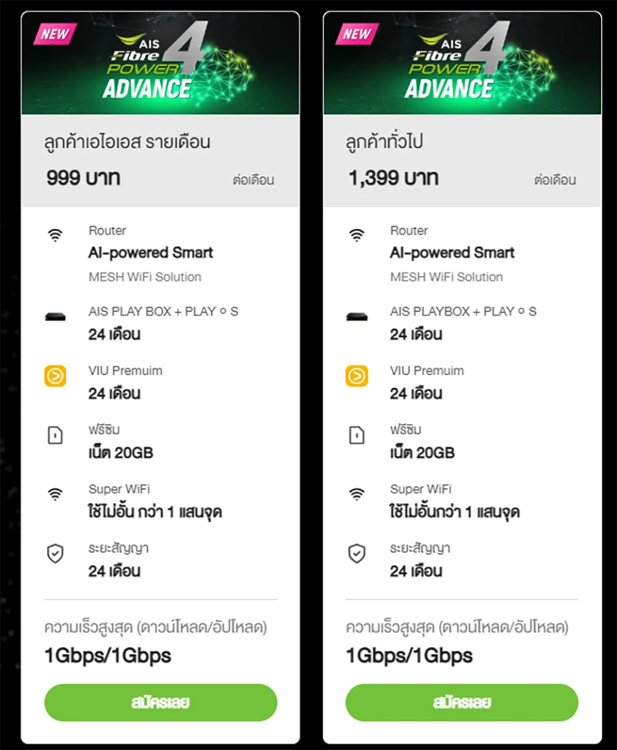 AIS พัฒนาไปอย่างไม่หยุดยั้ง ปัจจุบันมาพร้อมกับอินเทอร์เน็ตที่มีความเร็วในการดาวน์โหลดสูงถึง 2 Gbps เลยทีเดียว อีกทั้งยังมีแพ็กเกจที่รองรับการใช้งานของผู้คนหลากหลายรูปแบบ ไม่ว่าจะเป็น อินเทอร์เน็ตที่รองรับการ Work From Home, การเรียนออนไลน์, การขายของออนไลน์ และการสตรีมเกม เป็นต้น มีความเร็วให้เลือกหลากหลายระดับ มาพร้อมกับราคาแพ็กเกจแบบรวมกับกล่อง และแพ็กเกจที่รวมกับผู้ใช้งานเครือข่ายโทรศัพท์ด้วย เลือกดูได้ตามความเหมาะสมกันได้เลยค่ะ