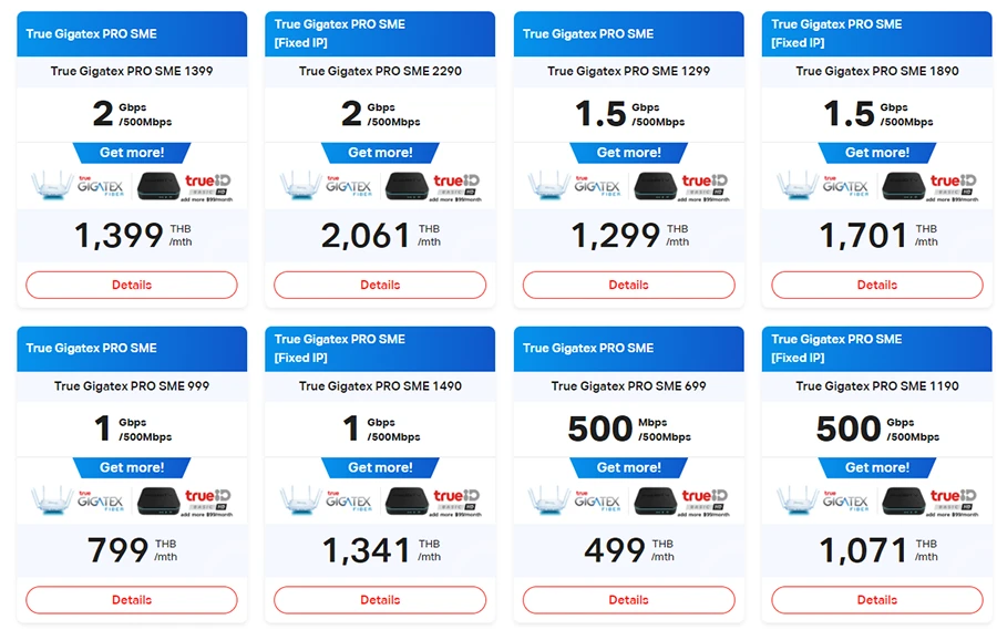 True Super Speed Fiber ก็เป็นอีกเจ้าที่มีอินเทอร์เน็ตความเร็วสูงถึง 2Gbps และมาพร้อมกับแพ็กเกจที่หลากหลาย ครอบคลุมผู้คนหลากหลายรูปแบบ หลากหลายอาชีพ รวมถึงแพ็กเกจแบบพ่วงกล่องทีวีดิจิตอล และพ่วงกับเครือข่ายมือถือ ในราคาที่หลากหลาย สามารถเลือกใช้งานได้ตามความเหมาะสมของตัวเองกันได้เลยค่ะ