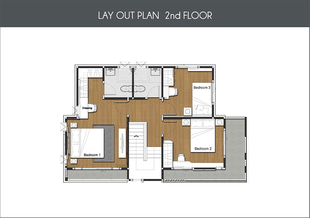 3 ห้องนอน, 3 ห้องน้ำ, 1 ห้องครัว และ 2 ที่จอดรถ (แบบบ้านขนาดเล็ก)