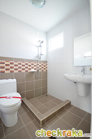 เริ่มจากห้องน้ำชั้นล่างของบ้านกัน มีติดตั้งฝักบัวให้อาบน้ำแต่ไม่ได้แยกพื้นส่วนเปียก ส่วนแห้งให้นะคะ