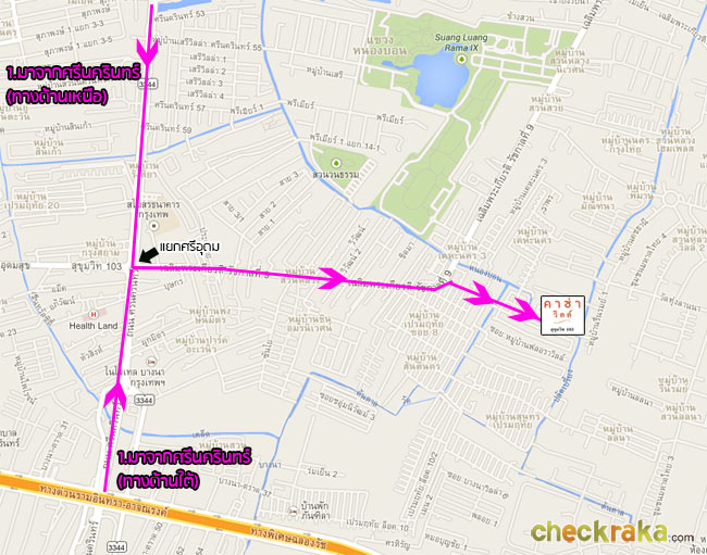 หากมาจากทางซีคอนสแควร์ (จากทางเหนือ) ให้ชิดซ้าย ระวังอย่าลงอุโมงค์ และเลี้ยวซ้ายที่สี่แยกเพื่อเข้าสู่ถนนเฉลิมพระเกียรติ ร.9 แล้วเดินทางต่อตามรูปภาพที่อธิบายข้างล่าง แต่หากมาจากทางถนนศรีนครินทร์ (ด้านใต้) เมื่อถึงสี่แยกศรีอุดมให้เตรียมเลี้ยวขวาที่สี่แยกนี้ (ระวังอย่าลงอุโมงค์) เพื่อเข้าสู่ถนนเฉลิมพระเกียรติ ร.9 แล้วเดินทางต่อตามรูปภาพที่อธิบายด้านบน